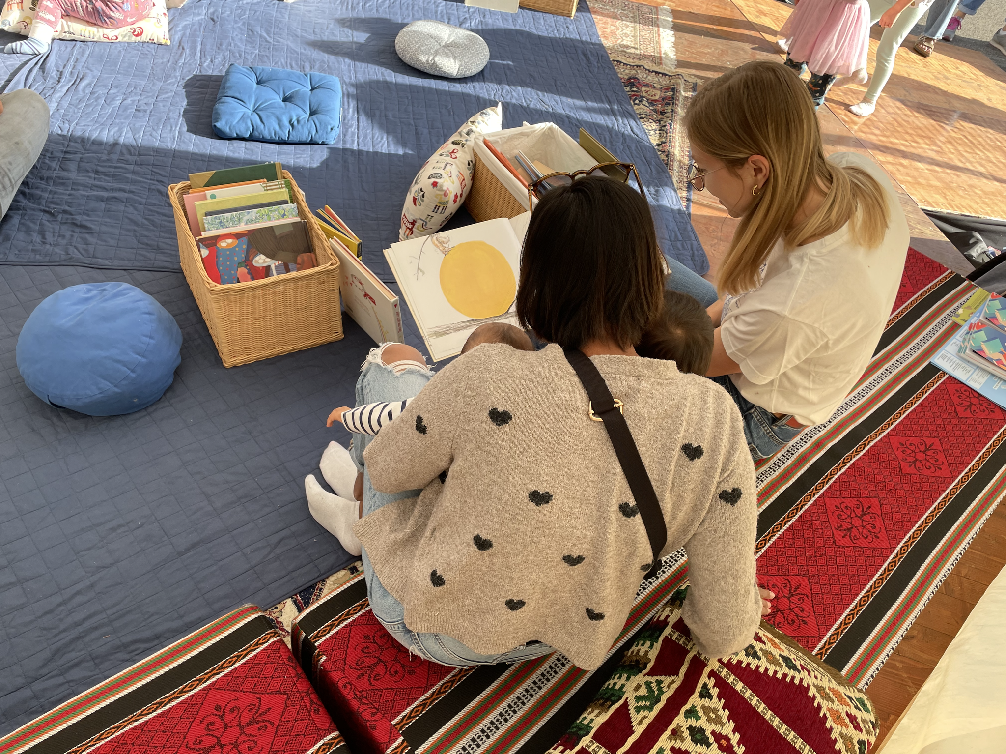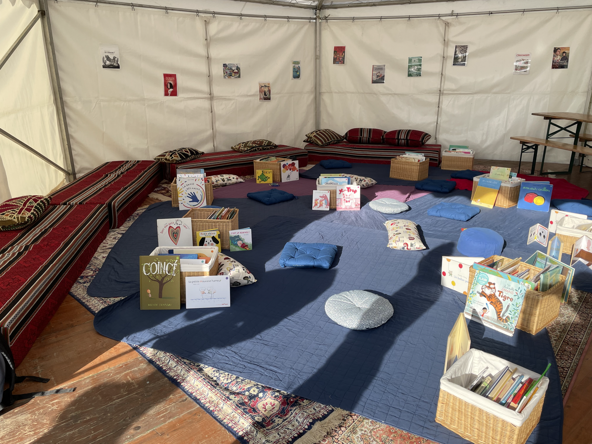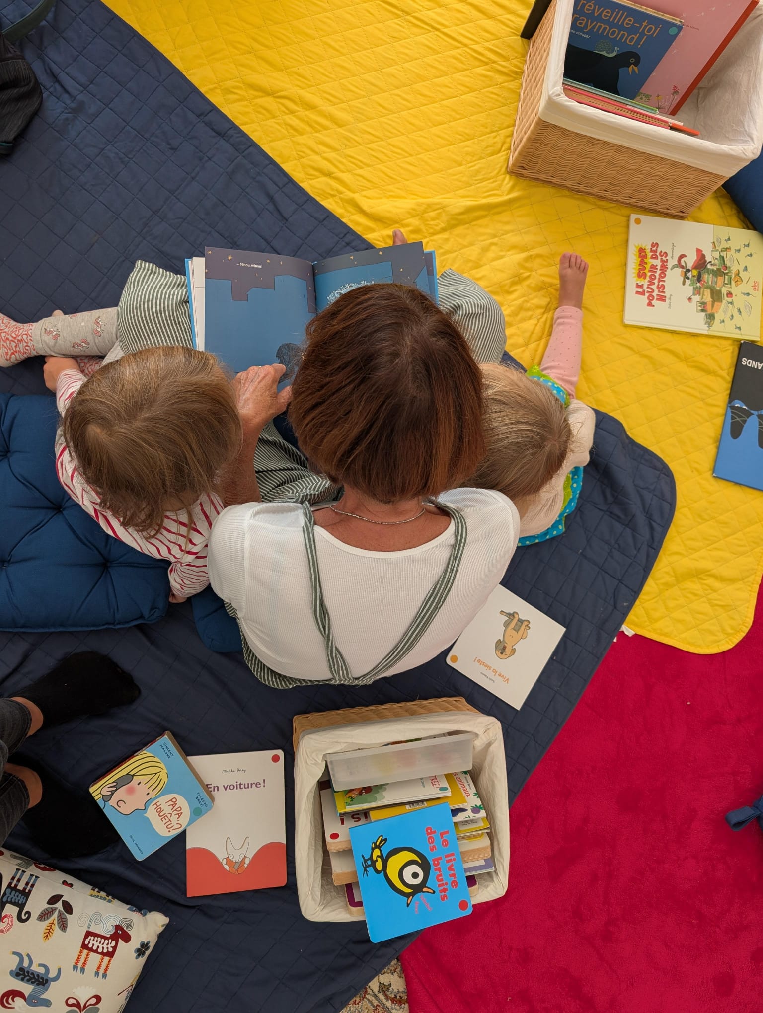 avec leurs couvertures, coussins et corbeilles remplies d'albums pour un moment de lecture d'histoires, de chants, de jeux et de rires. C'est un espace de rencontres et d'échanges entre petits et